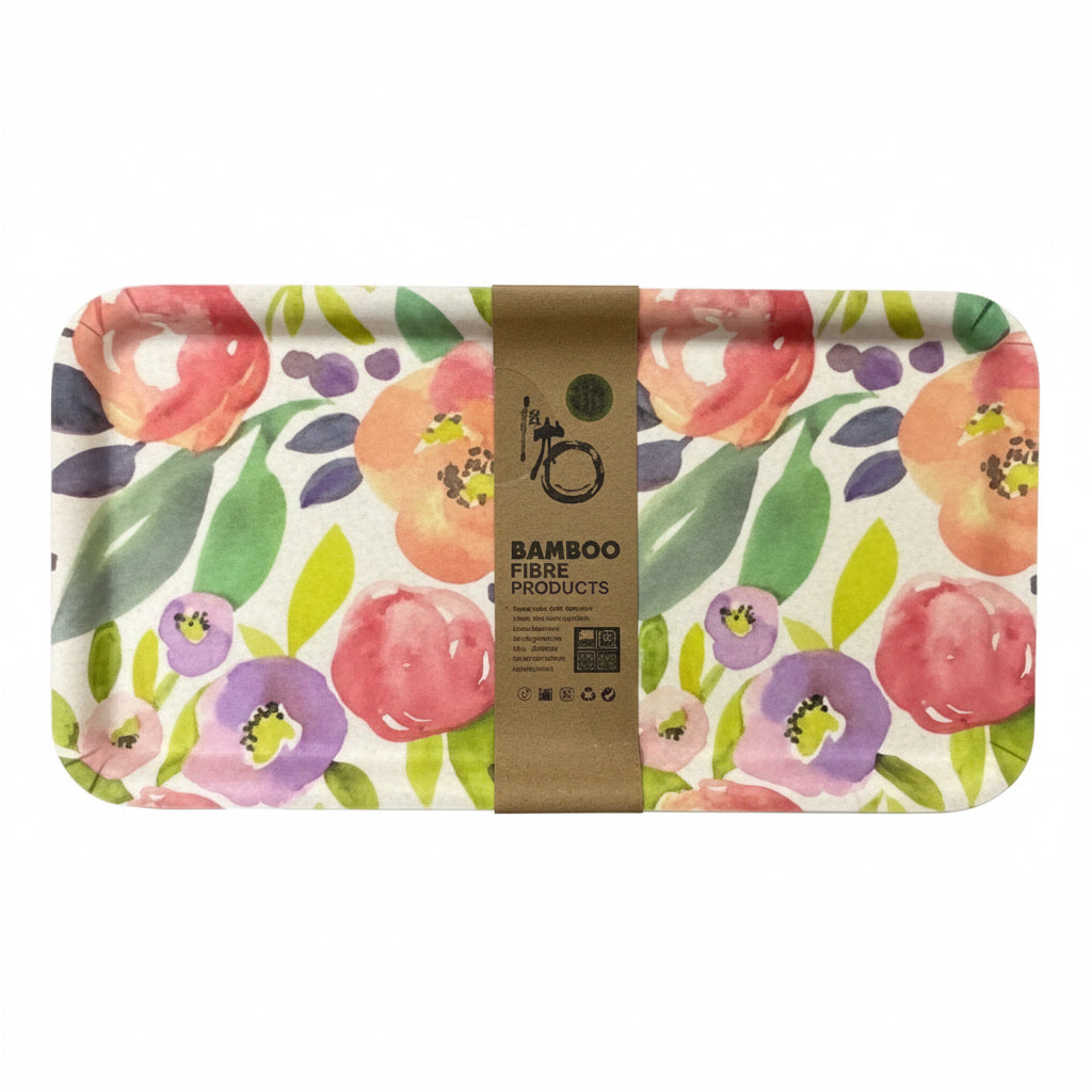 Leuk en handig dienblad van 30 x 15 cm, met een frisse en vrolijke bloemen print. Het dienblad is grotendeels gemaakt van bamboevezels en daardoor licht van gewicht.