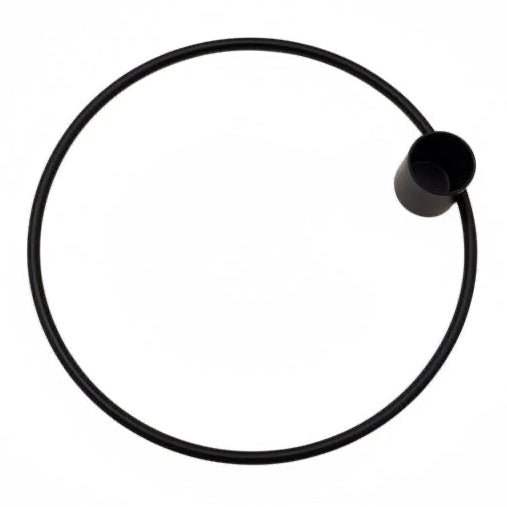 Zwarte metalen kandelaar in de vorm van een ring, met een afmeting van 15 x 15 cm.