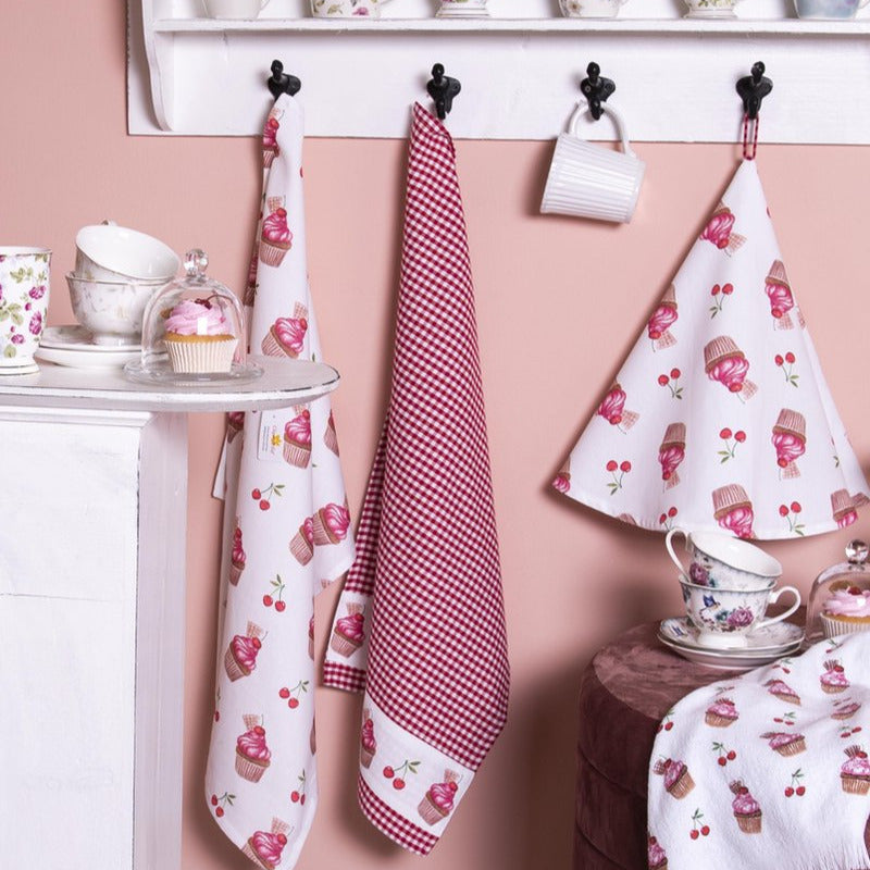 Keukendoek van katoen met een leuk en vrolijk motief met cupcakes. Vanwege het motief is deze keukendoek absoluut een toevoeging in jouw keuken. Praktisch en stijlvol! De keukendoek is gemaakt van 100% katoen, heeft een handig lusje om op te hangen en heeft een afmeting van70x50cm.