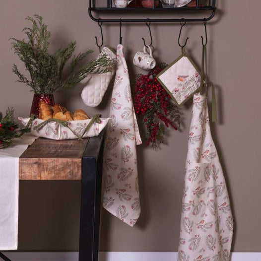 Katoenen keukendoek met dennentak motief in landelijke stijl met een romantische uitstraling. Door het basis patroon makkelijk te combineren met andere keukentextiel items. De keukendoek heeft een handig lusje om op te hangen en heeft een afmeting van 70 x 50 cm.