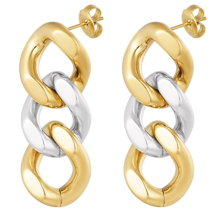 Hoe tof zijn deze gouden schakel oorbellen met drie schakels! Een echte eyecatcher! Daarnaast zijn de oorbellen superleuk te combineren met meerdere matchende sieraden en kun je zo zwel feestelijk als dagelijks dragen. De oorbellen zijn gemaakt van stainless steel en hebben een afmeting van 3,9 cm, ideaal!