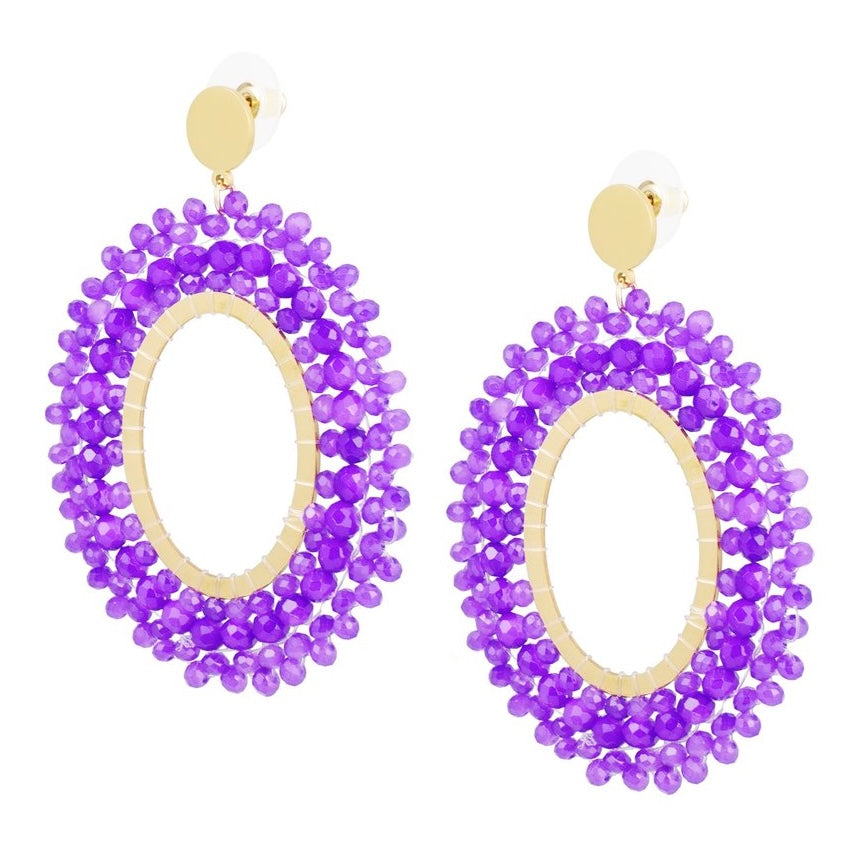 Hoe leuk zijn deze goud met paarse oorbellen, gemaakt van drie lagen kralen! Super trendy en perfect te dragen tijdens aankomend seizoen! De oorbellen zijn gemaakt van Stainless Steel in combinatie met kristalkralen en hebben een afmeting van 6,5 cm. De oorbellen hebben een vrolijke uitstraling en zijn daarmee uitstekend te combineren met meerdere matchende sieraden!