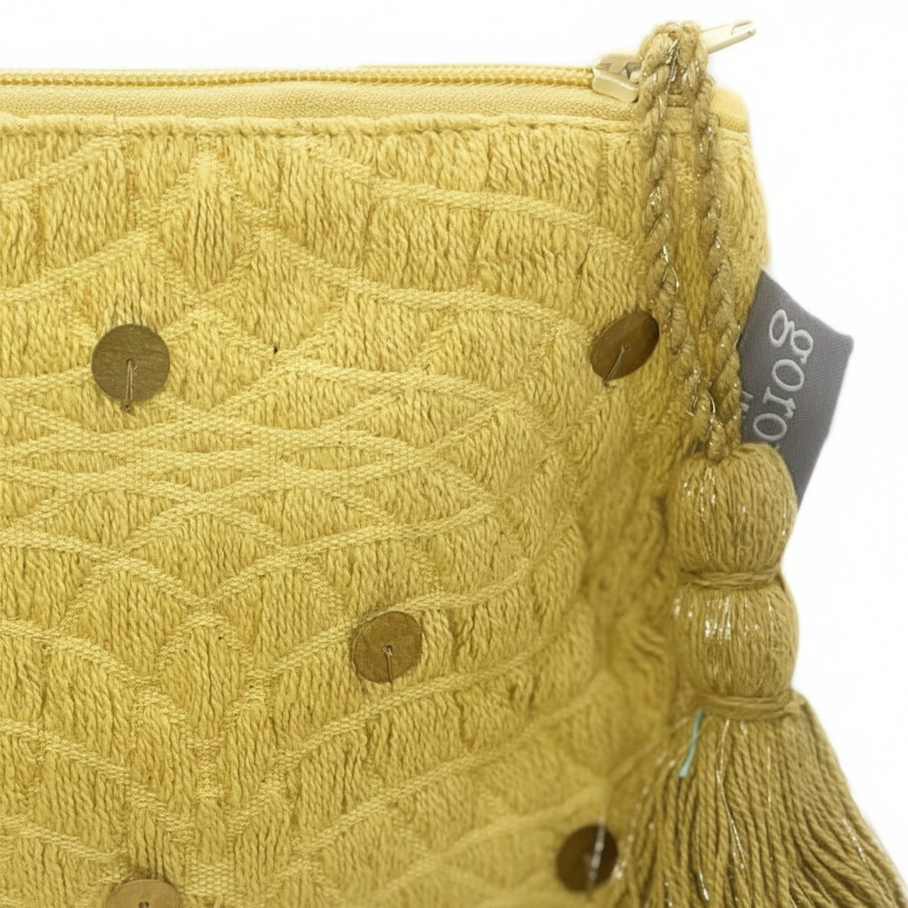 Jacquard geweven gele toilettas met grote kwast aan de rits. Deze musthave toilettas heeft een afmeting van 25x15cm en herbergt al je kleine spullen, van laders tot make-up, wat jij maar wil. Ook leuk om cadeau te doen